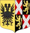 | Famille van der Meulen | parti : au I d'or à l'aigle bicéphale de gueules ; au II, écartelé, au 1 et 4 de gueules au sautoir d'hermine accompagné en pointe d'une molette d'or (qui est van de Voorde), au 2 et 3 de sable au lion d'argent armé, lampassé et couronné à l'antique d'or (qui est Brabant-Gaesbeek)[25] | ![]() |