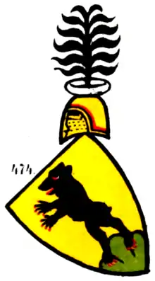Les armoiries représentent un ours noir sur une monture rouge à trois branches, le tout sur fond doré ou jaune[3]. Sur le casque figure des ornements noir-argent, agrémentées de feuilles de tilleul dorées à l'extérieur et un buisson de plumes d'autruche argenté[4].