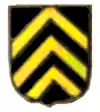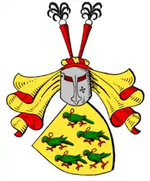 Plus tard, un blason écartelé avec deux casques devient courant. 1 et 4 les armoiries de la famille, 2 et 3 en noir trois chevrons dorés superposés. À droite le casque principal, à gauche le casque aux lambrequins noir et or coiffe deux cornes de buffle noir, chacune recouverte des trois chevrons dorés.