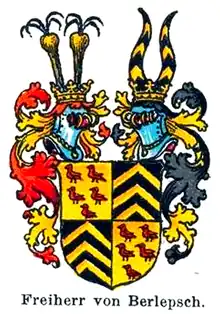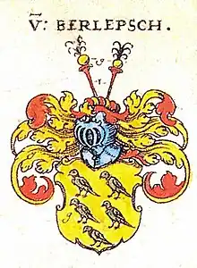 Selon Maximilian Gritzner et Adolf Matthias Hildebrandt, les armoiries des chevrons sont à l'origine les armoiries de la famille bohémienne von Berleviczko, avec laquelle les seigneurs de Berlepsch se considèrent autrefois comme liés par la filiation, selon Gritzner et Hildebrandt[35]. En 1858, les armoiries de la "très ancienne famille morave Bernewizko" (probablement le blason à chevrons) étaient considérées comme "encore utilisées aujourd'hui" par la famille Berlepsch[11].