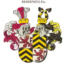 En 1867, huit ans après la publication de son livre par Kneschke, les seigneurs de Bernewitz sont autorisés à utiliser le titre baronnial - en 1858, ils s'appellent déjà "Barons de Bernewitz"[11]. En tout cas, ils ont un blason écartelé pans très semblable au blason écartelé de Berlepsch , avec trois chevrons dorés sur fond noir en 2 et 3 et trois plumes d'autruche sur le casque gauche et deux cornes de buffle sur le casque droit[37].