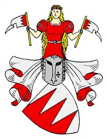 Le blason principal est divisé en trois points de rouge et d'argent. Sur le casque se tient une vierge en pleine croissance vêtue de rouge (également rouge et argent) avec une couronne de fleurs ou de perles dans ses cheveux dorés lâches, tenant dans chaque main tendue un drapeau dessiné en biais comme le bouclier. Les lambrequins sont rouge-argenté.