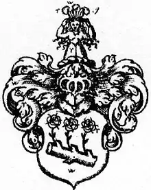 En argent, une branche naturelle allongée et tronquée d'où poussent trois roses rouges sur des tiges de feuilles vertes. Sur un casque avec une couverture rouge et argent, pousse une vierge vêtue de rouge, avec une couronne verte ornée de plumes d'autruche or, rouge et argent sur la tête.
