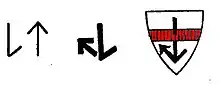 Le blason a une barre rouge dans le bouclier, à travers laquelle une ancre noire, mutilée sur le bras supérieur et gauche, est collée. Il y a 3 plumes de héron noir sur le casque, qui est recouvert de couvertures rouges et argentées.