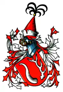 En rouge à droite une corne de buffle argentée, à gauche une baguette de cerf argentée ; sur le casque à lambrequins rouge et argent, un bonnet tatar rouge à revers argenté avec un bouton doré muni de six plumes de coq noires.