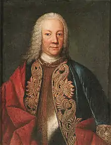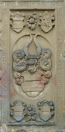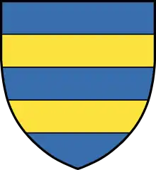 Les armoiries de la famille montrent deux barres dorées en bleu. Sur le casque aux lambrequins bleu et or figurent deux cornes de buffle inscrites comme le bouclier.