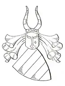 Deux barres rouges en argent. Sur le casque aux lambrequins rouges et argentées deux cornes de buffle marquées comme l'écu.