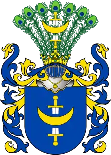 Les armoiries (de la communauté polonaise des armoiries Trzaska) montrent en bleu un croissant doré renversé entre deux épées d'argent brisées transversales avec des poignées dorées. Sur le casque couronné de lambrequins bleu et d'or couvre la figure de bouclier sur la queue d'un paon[1].
