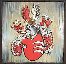 Les armoiries sont divisées en rouge et argent avec trois pics. Depuis la fin du XVIe siècle, il présente trois dents de loup en argent rouges qui s'incurvent vers le bas à partir du bord gauche de l'écu. Sur le casque aux lambrequins rouges et argentées se trouve un vol d'aigle ouvert, rouge à droite et argenté à gauche[4].