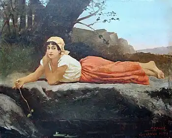 - Jeune fille aux pervenches. Peinture sur céramique ovale (27 × 20), 1888.
