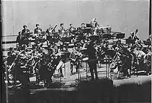 En 1963 Farah Pahlavi pris la direction du Anjoman-e Filarmonik Tehran (Orchestre symphonique de Téhéran), créé en 1953, lequel reçut un soutien financier direct du bureau de la reine. Grâce à ces subventions l'Orchestre philharmonique de Téhéran dirigé par Heshmat Sanjari (en) connut un premier âge d'or en 1963-1972. À cette époque, l'orchestre joua avec et sous la direction de musiciens internationaux comme Yehudi Menuhin, Zubin Mehta, Isaac Stern et Herbert von Karajan. Il y avait une séparation de l'orchestre d'opéra et de l'orchestre symphonique. L'orchestre donna non seulement des concerts à Téhéran, mais aussi à Abadan et à Chiraz. Dans la fin des années 1960, plus de 700 concerts avec des chefs étrangers et iraniens avaient été réalisés[25].