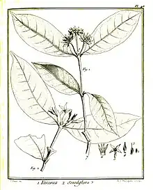 Fig. 1. Faramea corymbosa. On a repréſenté un rameau de grandeur naturelle. On a groſſi les parties détachées de la fleur. - 1. Stipules. - 2. Calice. - 3. Calice. Diſque. Style. Stigmates. - 4. Bouton de corolle. - 5. Fleur. - 6. Corolle ouverte. étamines. - 7. Étamine ſéparée.