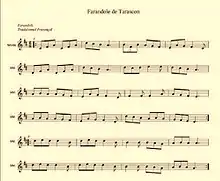 Ces indications sont reprises tant par le Centre national de ressources textuelles et lexicales[5], que par le Trésor de la Langue Française)[6]. Seule l'Encyclopédie Universalis développe : « Danse populaire provençale (farandoulo), sur une mesure à ![]()