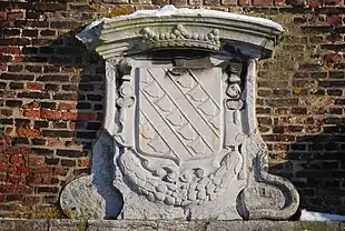 Blasonnement : Bandé de vair et de gueules de six pièces, l'écu sommé d'une couronne à trois fleurons séparés par un groupe de trois perles et entouré du collier de la toison d'or[8].