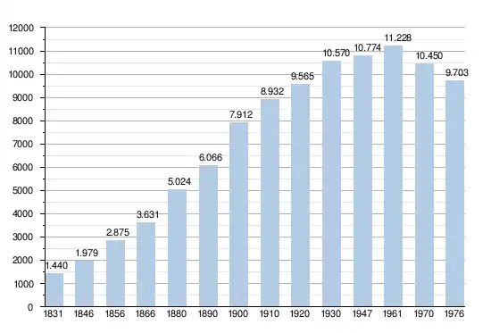 Les chiffres des années 1831 à 1970 tiennent compte des chiffres des anciennes communes fusionnées.