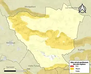 Le retrait-gonflement des sols argileux est susceptible d'engendrer des dommages importants aux bâtiments en cas d’alternance de périodes de sécheresse et de pluie. 32,4 % de la superficie communale est en aléa moyen ou fort (19,2 % au niveau départemental et 48,5 % au niveau national). Sur les 152 bâtiments dénombrés sur la commune en 2019, 63 sont en aléa moyen ou fort, soit 41 %, à comparer aux 17 % au niveau départemental et 54 % au niveau national. Une cartographie de l'exposition du territoire national au retrait gonflement des sols argileux est disponible sur le site du BRGM[20],[Carte 2].