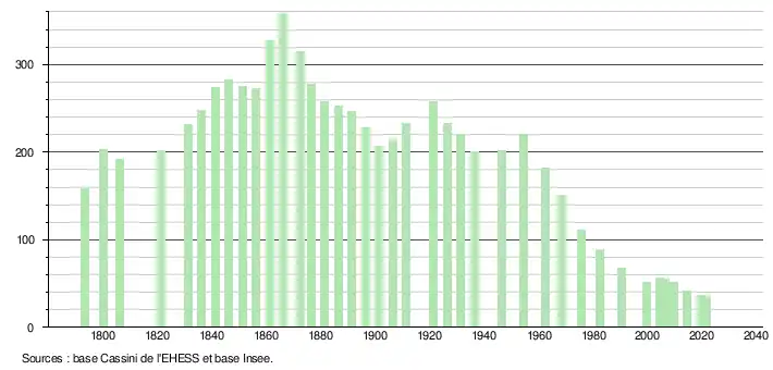 L'évolution du nombre d'habitants est connue à travers les recensements de la population effectués dans la commune depuis 1793. Pour les communes de moins de 10 000 habitants, une enquête de recensement portant sur toute la population est réalisée tous les cinq ans, les populations légales des années intermédiaires étant quant à elles estimées par interpolation ou extrapolation[14]. Pour la commune, le premier recensement exhaustif entrant dans le cadre du nouveau dispositif a été réalisé en 2004[15].