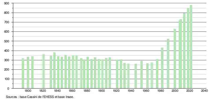 L'évolution du nombre d'habitants est connue à travers les recensements de la population effectués dans la commune depuis 1793. Pour les communes de moins de 10 000 habitants, une enquête de recensement portant sur toute la population est réalisée tous les cinq ans, les populations légales des années intermédiaires étant quant à elles estimées par interpolation ou extrapolation[19]. Pour la commune, le premier recensement exhaustif entrant dans le cadre du nouveau dispositif a été réalisé en 2007[20].