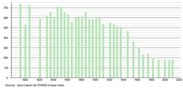 L'évolution du nombre d'habitants est connue à travers les recensements de la population effectués dans la commune depuis 1793. À partir du , les populations légales des communes sont publiées annuellement dans le cadre d'un recensement qui repose désormais sur une collecte d'information annuelle, concernant successivement tous les territoires communaux au cours d'une période de cinq ans. Pour les communes de moins de 10 000 habitants, une enquête de recensement portant sur toute la population est réalisée tous les cinq ans, les populations légales des années intermédiaires étant quant à elles estimées par interpolation ou extrapolation[3]. Pour la commune, le premier recensement exhaustif entrant dans le cadre du nouveau dispositif a été réalisé en 2005[4],[Note 1].
