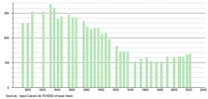 L'évolution du nombre d'habitants est connue à travers les recensements de la population effectués dans la commune depuis 1793. Pour les communes de moins de 10 000 habitants, une enquête de recensement portant sur toute la population est réalisée tous les cinq ans, les populations légales des années intermédiaires étant quant à elles estimées par interpolation ou extrapolation[17]. Pour la commune, le premier recensement exhaustif entrant dans le cadre du nouveau dispositif a été réalisé en 2007[18].