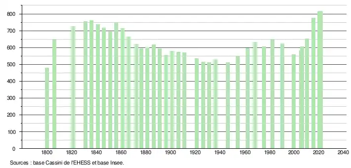 L'évolution du nombre d'habitants est connue à travers les recensements de la population effectués dans la commune depuis 1800. Pour les communes de moins de 10 000 habitants, une enquête de recensement portant sur toute la population est réalisée tous les cinq ans, les populations légales des années intermédiaires étant quant à elles estimées par interpolation ou extrapolation[29]. Pour la commune, le premier recensement exhaustif entrant dans le cadre du nouveau dispositif a été réalisé en 2005[30].