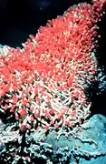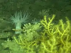 - Les récifs d'éponges : ces récifs sont constitués essentiellement d'éponges Heterochone calix, mais aussi d'Aphrocallistes vastus et de Farrea occa, qui abritent beaucoup d'espèces et peuvent couvrir plusieurs kilomètres entre 100 et 250 mètres de profondeur[19].