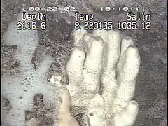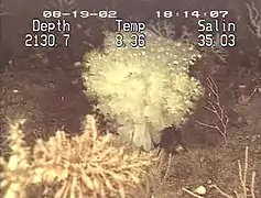 - Les suintements froids (ou mofettes) beaucoup plus répandus puisque pouvant se trouver dans des eaux peu profondes ou dans des sources chaudes sur Terre. Ce sont des petits trous d'où sortent continuellement des gaz sous forme de bulles qui peuvent être de compositions variées : soufre, dioxyde de carbone, hydrocarbures, méthane, etc. Dans la zone aphotique il arrive que des suintements froids lâchent des hydrocarbures ou du méthane. Des bactéries spécialisées peuvent alors fixer ces gaz pour en faire des nutriments, comme chez les communautés hydrothermales. C'est donc à proximité de ces suintements que de nombreux animaux marins se développent, par exemple vestimentifères, bivalves, coraux mous ou crustacés. C’est dans le golfe du Mexique, à plus de 3 000 mètres de profondeur, que l'on a trouvé, autour d'un lac sous-marin, une grande communauté d'animaux s'étant développés grâce aux suintements de méthane présents autour du lac. Il arrive aussi que des communautés d'animaux vivant en symbiose avec des bactéries fixant le méthane se développent sur des fonds sans suintements de méthane. Dans ce cas, des terres riches en méthane sont apportées par les glissements de terrain et les courants venus plus d'en bas.