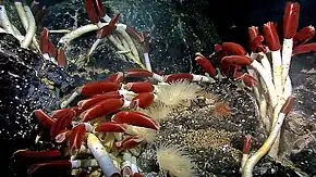 - l’adaptation à la vie à proximité des monts hydrothermaux, des suintements froids qui émettent des gaz (sulfure d'hydrogène pour les fumeurs noirs, silices et anhydrites pour les fumeurs blancs, méthane et hydrocarbures pour certains suintements froids, etc.) qui font l'objet d'une chimiosynthèse par les bactéries (parfois symbiotiques) ce qui permet à de nombreux animaux de se nourrir et de se protéger de la chaleur des cheminées hydrothermales[réf. nécessaire].