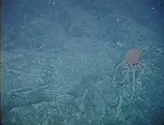 Un poulpe (Bentoctopus sp.) un crinoïde et une actinie au mont sous-marin de Davidson (-2422 m)