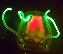 - défense par éjection de sécrétions luminescentes sur le prédateur, l'aveuglant pendant quelques secondes (utilisée chez certains invertébrés, comme des calmars, des crevettes, des vers ou des méduses abyssales). D'autres animaux trompent leurs prédateurs : les portes-lanternes font clignoter les organes bioluminescents sur leurs joues. On a récemment découvert un ver Swima bombiviridis, aveugle, mesurant de 18 à 93 mm, et vivant de −1 800 à −3 800 mètres de fond, qui largue des bulles bioluminescentes comme leurre avant de fuir ses prédateurs[18]. Ces leurres sont de minuscules ballonnets emplis d'hémolymphe (diamètre de 0,7 à 1,1 mm) qui croissent près de sa tête. Quand elles sont libérées, ces petites bulles émettent durant quelques secondes une lumière intense qui semble pouvoir dérouter la plupart des prédateurs de cette espèce, laissant au ver quelques secondes de répit pour s'enfuir ;