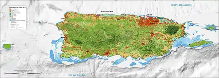On distingue trois grandes régions naturelles à Porto Rico : un massif montagneux qui occupe tout le centre de l'île et culmine à 1 338 mètres à Cerro La Punta, des plaines côtières sur le pourtour de l'île principale et une région karstique au nord de l'île, issue de la dissolution par l'eau de roches d'origine volcanique[11].