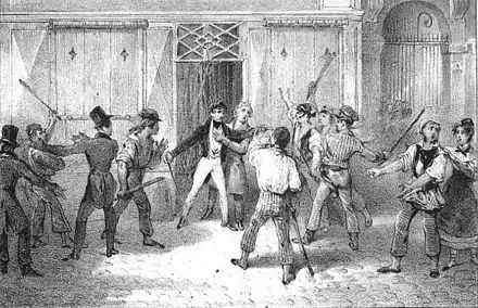 - « Il est toutefois deux faits qu’il faut noter, parce qu’ils sont des indices du sentiment populaire. On sait que, dans la journée des 27 et 28, toutes les enseignes des marchands brevetés de la Cour avaient été maculés ou brisées. L’enseigne de l’armurier Lepage, rue de Richelieu, portaient ces mots: Arquebusier de Son Altesse Royale Monseigneur le duc d’Orléans. Le peuple avait barbouillé de noir le titre d’Altesse Royale, et avait soigneusement respecté le nom du duc d’Orléans[19]. »