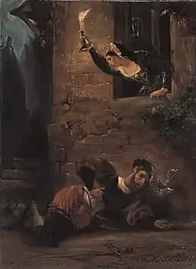 Faust et Méphisto, au galop sur des chevaux noirs, aperçoivent une ghilde de sorciers (Hexenzunft) autour de la Roche-aux-Corbeaux (um den Rabenstein), là où on édifie le gibet.
