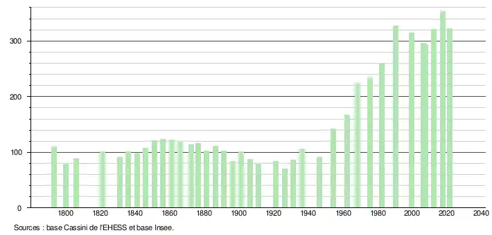 L'évolution du nombre d'habitants est connue à travers les recensements de la population effectués dans la commune depuis 1793. Pour les communes de moins de 10 000 habitants, une enquête de recensement portant sur toute la population est réalisée tous les cinq ans, les populations légales des années intermédiaires étant quant à elles estimées par interpolation ou extrapolation[19]. Pour la commune, le premier recensement exhaustif entrant dans le cadre du nouveau dispositif a été réalisé en 2007[20].