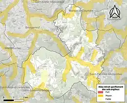 Le retrait-gonflement des sols argileux est susceptible d'engendrer des dommages importants aux bâtiments en cas d’alternance de périodes de sécheresse et de pluie. 20,9 % de la superficie communale est en aléa moyen ou fort (33,6 % au niveau départemental et 48,5 % au niveau national). Sur les 129 bâtiments dénombrés sur la commune en 2019, 32 sont en aléa moyen ou fort, soit 25 %, à comparer aux 25 % au niveau départemental et 54 % au niveau national. Une cartographie de l'exposition du territoire national au retrait gonflement des sols argileux est disponible sur le site du BRGM[17],[Carte 2].