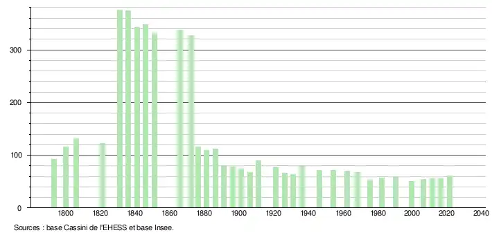 L'évolution du nombre d'habitants est connue à travers les recensements de la population effectués dans la commune depuis 1793. Pour les communes de moins de 10 000 habitants, une enquête de recensement portant sur toute la population est réalisée tous les cinq ans, les populations légales des années intermédiaires étant quant à elles estimées par interpolation ou extrapolation[27]. Pour la commune, le premier recensement exhaustif entrant dans le cadre du nouveau dispositif a été réalisé en 2006[28].