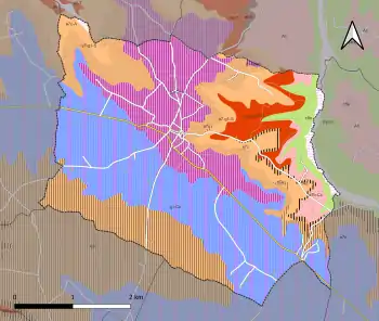 L'occupation des sols de la commune, telle qu'elle ressort de la base de données européenne d’occupation biophysique des sols Corine Land Cover (CLC), est marquée par l'importance des territoires agricoles (68,5 % en 2018), néanmoins en diminution par rapport à 1990 (71,4 %). La répartition détaillée en 2018 est la suivante : terres arables (37,4 %), forêts (26,3 %), zones agricoles hétérogènes (24,2 %), prairies (6,9 %), zones urbanisées (3,7 %), zones industrielles ou commerciales et réseaux de communication (1,6 %)[34]. L'évolution de l’occupation des sols de la commune et de ses infrastructures peut être observée sur les différentes représentations cartographiques du territoire : la carte de Cassini (XVIIIe siècle), la carte d'état-major (1820-1866) et les cartes ou photos aériennes de l'IGN pour la période actuelle (1950 à aujourd'hui)[Carte 3].