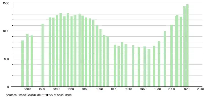 L'évolution du nombre d'habitants est connue à travers les recensements de la population effectués dans la commune depuis 1793. Pour les communes de moins de 10 000 habitants, une enquête de recensement portant sur toute la population est réalisée tous les cinq ans, les populations légales des années intermédiaires étant quant à elles estimées par interpolation ou extrapolation[23]. Pour la commune, le premier recensement exhaustif entrant dans le cadre du nouveau dispositif a été réalisé en 2007[24].