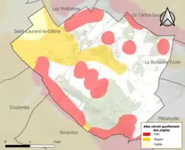 Le retrait-gonflement des sols argileux est susceptible d'engendrer des dommages importants aux bâtiments en cas d’alternance de périodes de sécheresse et de pluie. 43 % de la superficie communale est en aléa moyen ou fort (52,8 % au niveau départemental et 48,5 % au niveau national). Sur les 408 bâtiments dénombrés sur la commune en 2019, 149 sont en aléa moyen ou fort, soit 37 %, à comparer aux 70 % au niveau départemental et 54 % au niveau national. Une cartographie de l'exposition du territoire national au retrait gonflement des sols argileux est disponible sur le site du BRGM[16],[Carte 2].