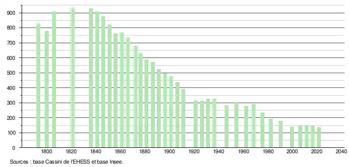 L'évolution du nombre d'habitants est connue à travers les recensements de la population effectués dans la commune depuis 1793. Pour les communes de moins de 10 000 habitants, une enquête de recensement portant sur toute la population est réalisée tous les cinq ans, les populations légales des années intermédiaires étant quant à elles estimées par interpolation ou extrapolation[17]. Pour la commune, le premier recensement exhaustif entrant dans le cadre du nouveau dispositif a été réalisé en 2006[18].