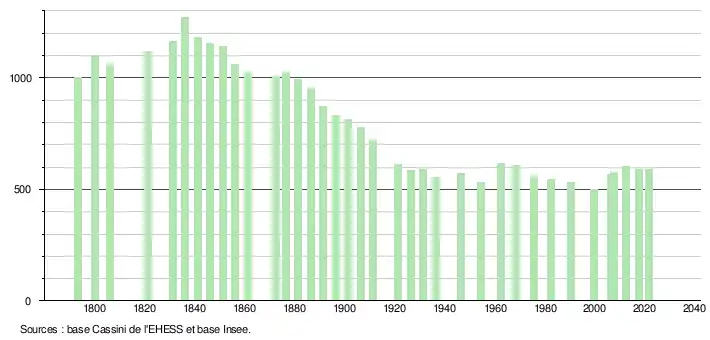 L'évolution du nombre d'habitants est connue à travers les recensements de la population effectués dans la commune depuis 1793. Pour les communes de moins de 10 000 habitants, une enquête de recensement portant sur toute la population est réalisée tous les cinq ans, les populations légales des années intermédiaires étant quant à elles estimées par interpolation ou extrapolation[24]. Pour la commune, le premier recensement exhaustif entrant dans le cadre du nouveau dispositif a été réalisé en 2007[25].