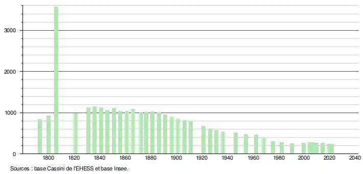 L'évolution du nombre d'habitants est connue à travers les recensements de la population effectués dans la commune depuis 1793. Pour les communes de moins de 10 000 habitants, une enquête de recensement portant sur toute la population est réalisée tous les cinq ans, les populations légales des années intermédiaires étant quant à elles estimées par interpolation ou extrapolation[44]. Pour la commune, le premier recensement exhaustif entrant dans le cadre du nouveau dispositif a été réalisé en 2004[45].
