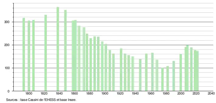 L'évolution du nombre d'habitants est connue à travers les recensements de la population effectués dans la commune depuis 1793. Pour les communes de moins de 10 000 habitants, une enquête de recensement portant sur toute la population est réalisée tous les cinq ans, les populations légales des années intermédiaires étant quant à elles estimées par interpolation ou extrapolation[16]. Pour la commune, le premier recensement exhaustif entrant dans le cadre du nouveau dispositif a été réalisé en 2008[17].
