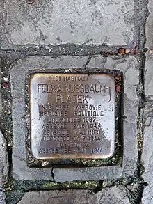 Des pavés de mémoire (Stolpersteine) sont déposés en hommage à Felix Nussbaum et Felka Platek devant leur maison de la rue Archimède à Bruxelles[10].