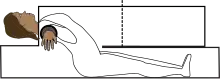 Variante 1.Une variante présente la face avant de la boîte au public (A). Étant donné que la boîte est de la taille d'un corps ordinaire, ils peuvent supposer que la "victime" est installée (B), perpendiculairement à la direction de la scie. En réalité, la boîte est plus profonde (ce que le public ne peut pas voir depuis leur perspective), et la "victime" recroquevillée pour échapper à la lame (C).