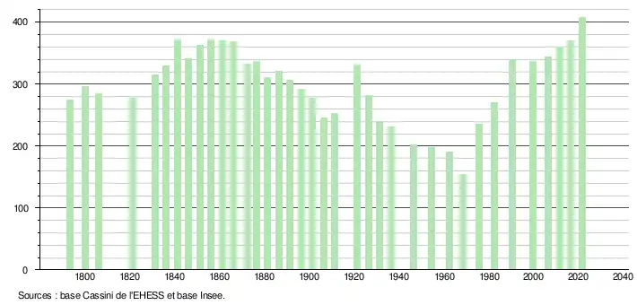 L'évolution du nombre d'habitants est connue à travers les recensements de la population effectués dans la commune depuis 1793. Pour les communes de moins de 10 000 habitants, une enquête de recensement portant sur toute la population est réalisée tous les cinq ans, les populations légales des années intermédiaires étant quant à elles estimées par interpolation ou extrapolation[16]. Pour la commune, le premier recensement exhaustif entrant dans le cadre du nouveau dispositif a été réalisé en 2006[17].