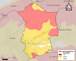 Le retrait-gonflement des sols argileux est susceptible d'engendrer des dommages importants aux bâtiments en cas d’alternance de périodes de sécheresse et de pluie. 96,7 % de la superficie communale est en aléa moyen ou fort (90,2 % au niveau départemental et 48,5 % au niveau national). Sur les 226 bâtiments dénombrés sur la commune en 2019, 223 sont en aléa moyen ou fort, soit 99 %, à comparer aux 91 % au niveau départemental et 54 % au niveau national. Une cartographie de l'exposition du territoire national au retrait gonflement des sols argileux est disponible sur le site du BRGM[19],[20].