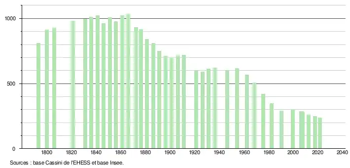 L'évolution du nombre d'habitants est connue à travers les recensements de la population effectués dans la commune depuis 1793. Pour les communes de moins de 10 000 habitants, une enquête de recensement portant sur toute la population est réalisée tous les cinq ans, les populations légales des années intermédiaires étant quant à elles estimées par interpolation ou extrapolation[22]. Pour la commune, le premier recensement exhaustif entrant dans le cadre du nouveau dispositif a été réalisé en 2007[23].