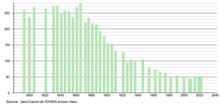 L'évolution du nombre d'habitants est connue à travers les recensements de la population effectués dans la commune depuis 1793. Pour les communes de moins de 10 000 habitants, une enquête de recensement portant sur toute la population est réalisée tous les cinq ans, les populations légales des années intermédiaires étant quant à elles estimées par interpolation ou extrapolation[18]. Pour la commune, le premier recensement exhaustif entrant dans le cadre du nouveau dispositif a été réalisé en 2008[19].