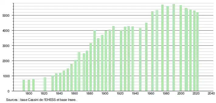 L'évolution du nombre d'habitants est connue à travers les recensements de la population effectués dans la commune depuis 1793. Pour les communes de moins de 10 000 habitants, une enquête de recensement portant sur toute la population est réalisée tous les cinq ans, les populations légales des années intermédiaires étant quant à elles estimées par interpolation ou extrapolation[32]. Pour la commune, le premier recensement exhaustif entrant dans le cadre du nouveau dispositif a été réalisé en 2007[33].